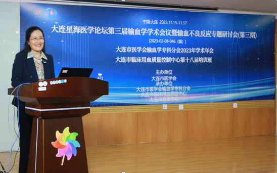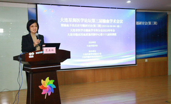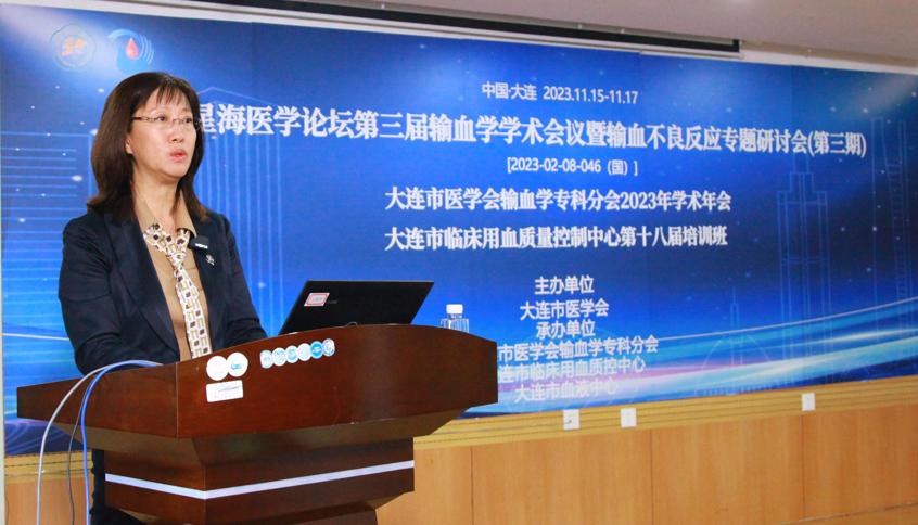 中国输血协会常务理事、中国输血协会献血动员专业委员会主任委员、辽宁省医学会输血学专科分会副主任委员、大连市医学会输血学专科分会前任主任委员、大连市血液中心主任兼大连市临床用血质量控制中心主任梁晓华致辞